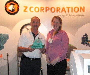 Kaitlin O'Brien, Marketing Associate for Z Corp. presenting Miroslav the 3D print of the Ducati Desmo head.